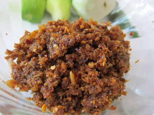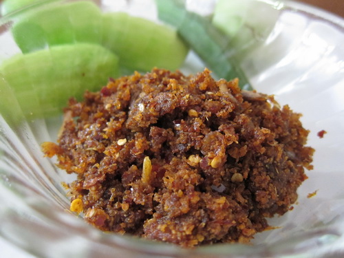 โขลกกระเทียม หอมแดง แล้วนำไปผัดกับน้ำมันมะกอกให้เหลือง เติมพริกป่นลงไปผัด แล้วเติมถั่วเน่าลงไปผัดพอเข้ากันดี เติมกากถั่วลงไป แล้วปรุงรสตามชอบ ของที่บ้านจะทำหวานกับเปรี้ยวนำเลยใส่น้ำตาลปี๊บกับน้ำมะขามเปียกเยอะหน่อย