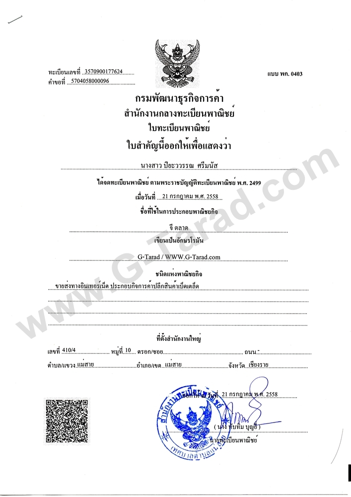 www.G-Tarad.comได้จดทะเบียนพาณิชย์อิเล็กทรอนิกส์ รับรองโดย กรมพัฒนาธุรกิจการค้า สำนักงานกลางทะเบียนพาณิชย์ เรียบร้อยแล้ว